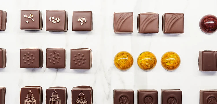 ショコラをパリの20のアロンディスマンに見立て、行政区の番号や、そのエリアにまつわるモニュメントをデザインしました。区の番号や、ルーブル美術館のピラミッドなどがショコラに施されています。
